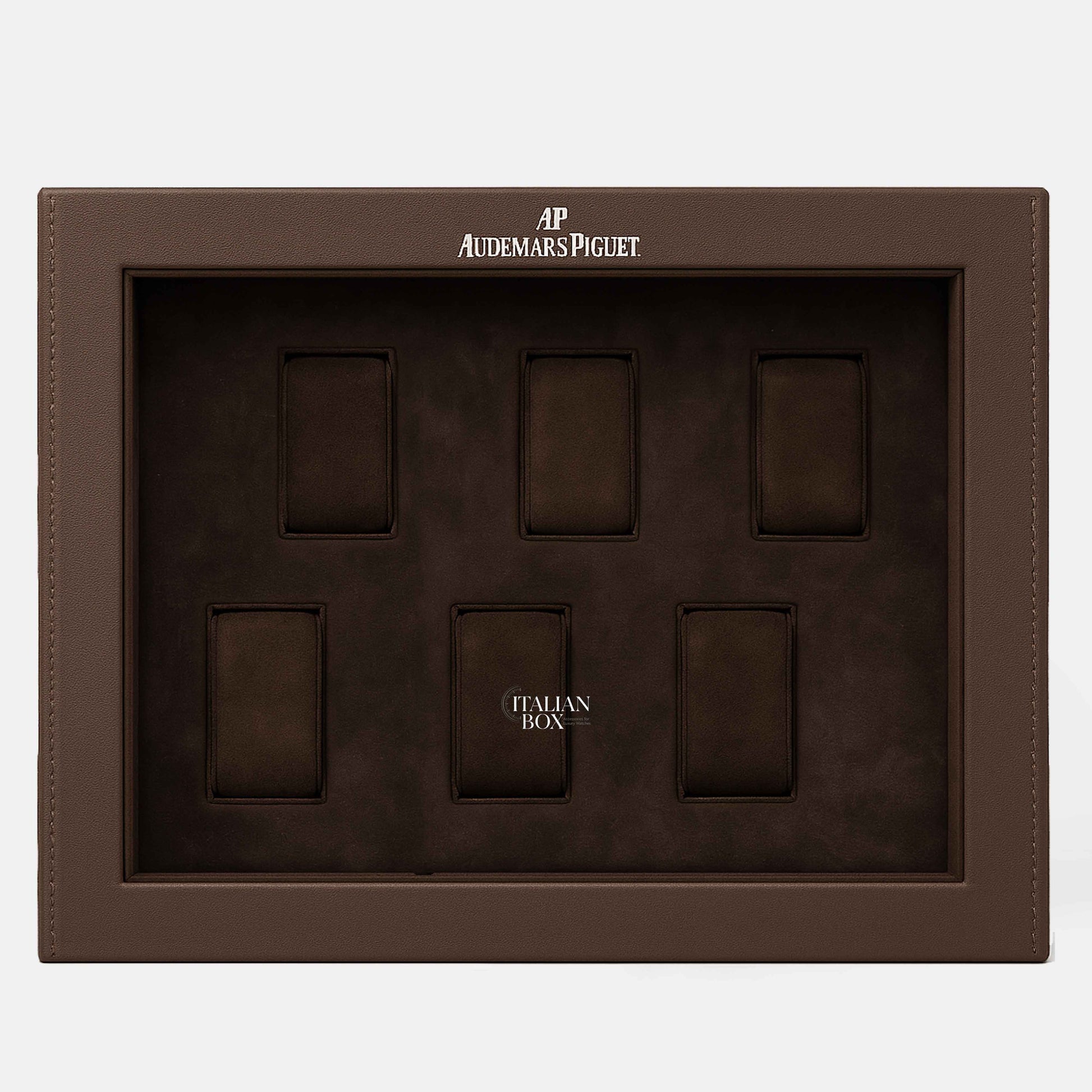 This brown leather Audemars Piguet tray is designed to elegantly hold six timepieces, with a warm brown Alcantara interior that offers both protection and sophistication.