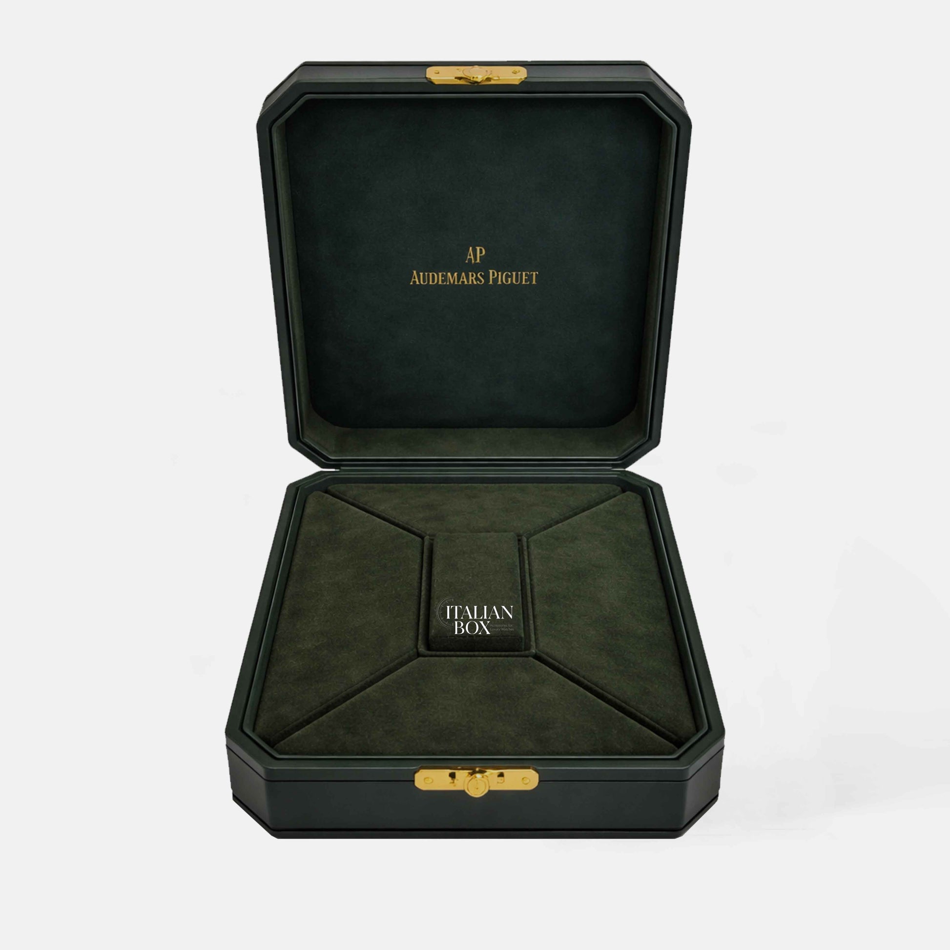 A vintage Audemars Piguet presentation box in green leather, featuring a refined classic design and high-quality craftsmanship.