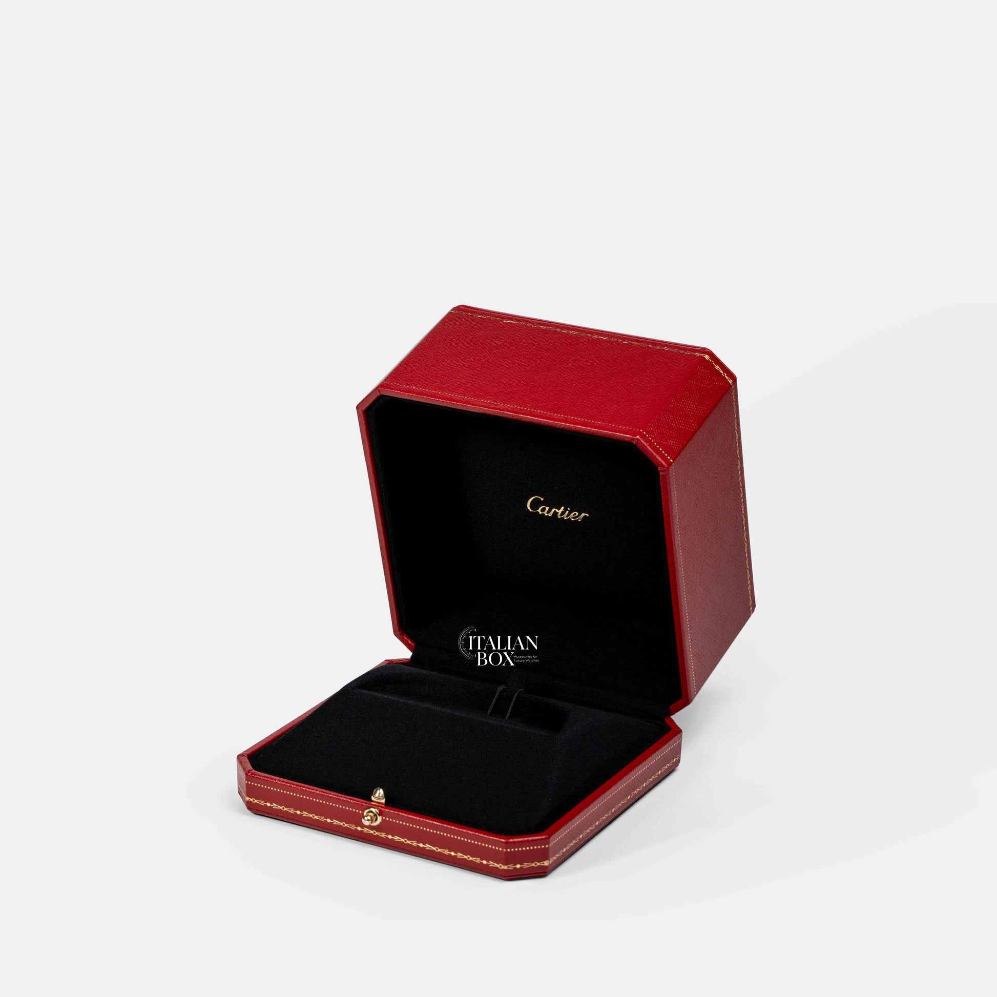 Elegant red Cartier box with a black interior, specially designed to hold the iconic Cartier 'Love' bracelet.