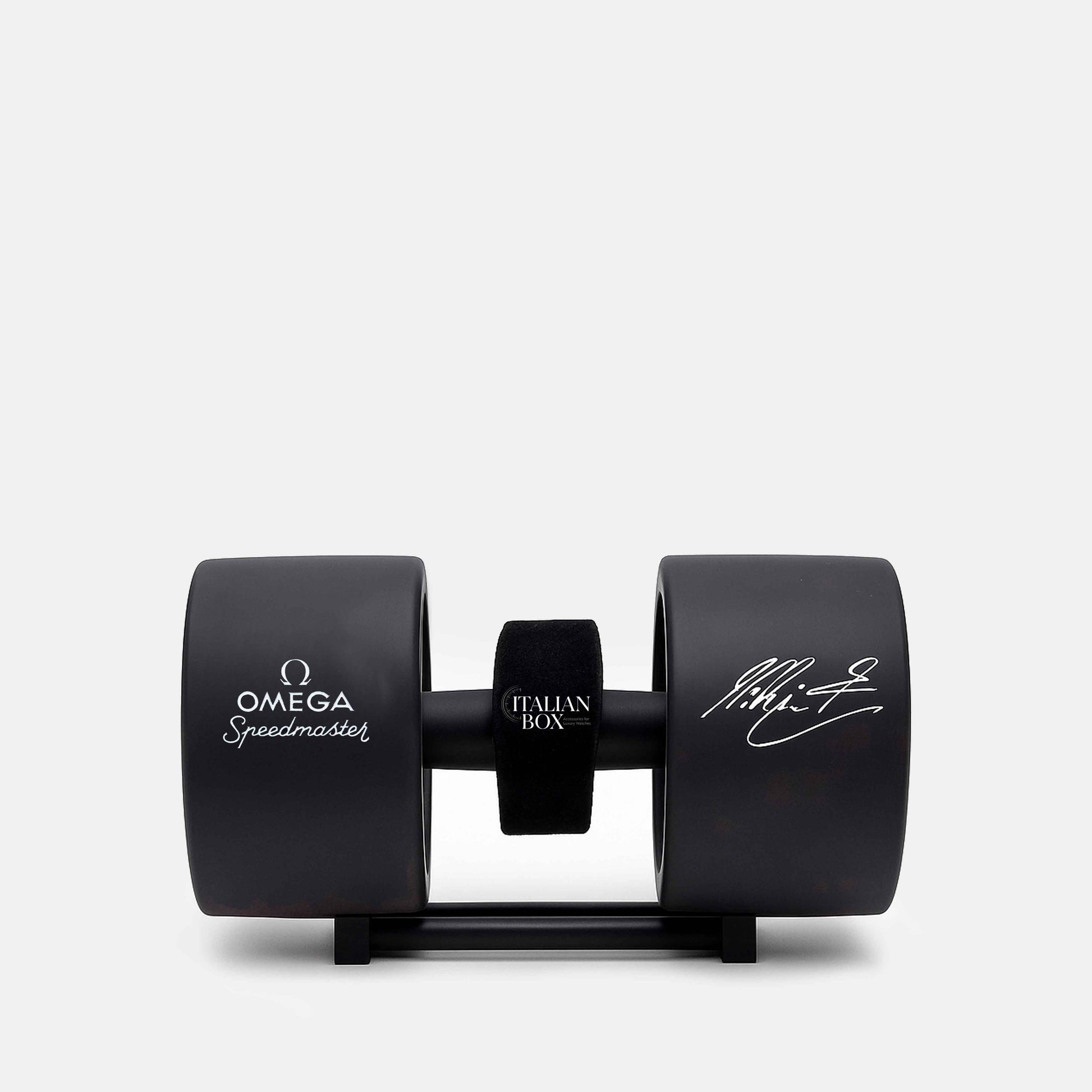 Exclusive Omega Speedmaster Schumacher Racing watch holder, featuring a sleek black design with Michael Schumacher’s signature and the Speedmaster logo.
