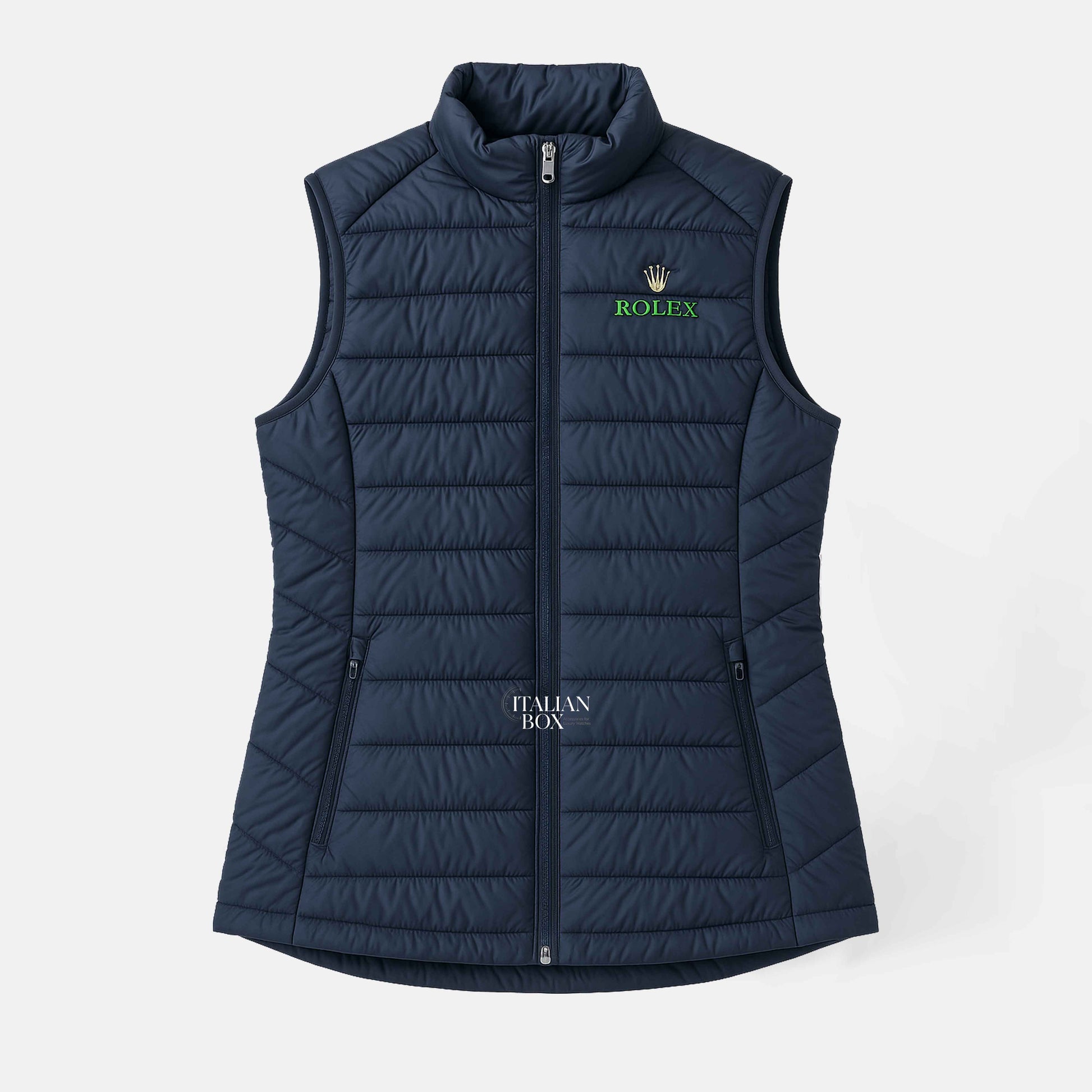 Blue sleeveless Rolex vest featuring the iconic green embroidered logo on the chest.
